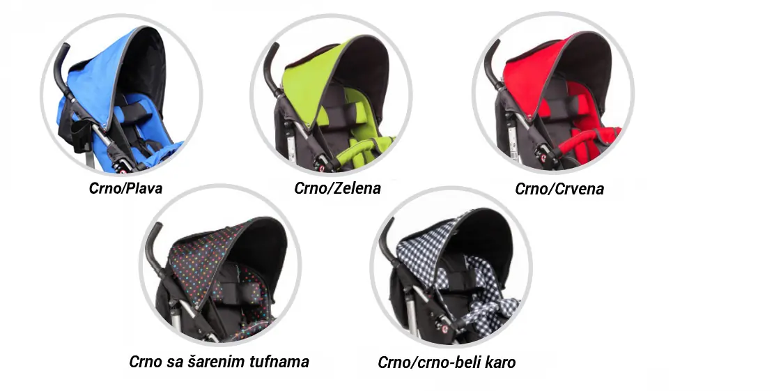 Kolica imaju preklopivi aluminijumski ram sa čeličnim ojačanjima, što ih čini laganim, ali izuzetno stabilnim. Naslon za leđa se podešava bez napora, omogućavajući položaj koji najbolje odgovara detetovim potrebama. Tapacirung je izrađen od visokokvalitetne tkanine sa međunarodnim sertifikatima (OEKO-TEX i SGS), prijatan je na dodir i jednostavan za održavanje.